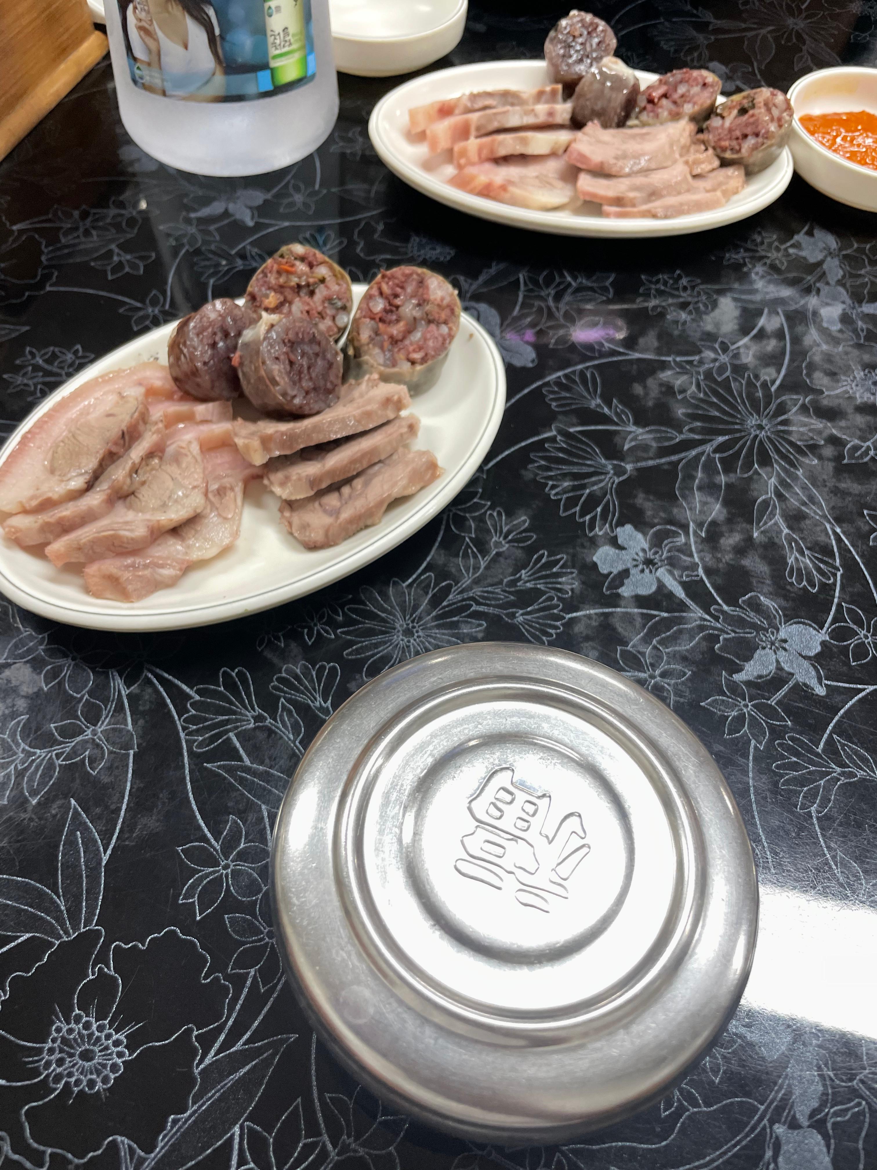 정식에 딸려 나오는 순대와 머릿고기는 잡내가 없고 아주 맛있, 쫀드윽하게 잘 삶아진 수육이었다.